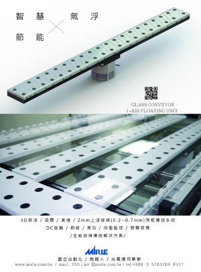 然而,現今(jin)主流(liu)的(de)面板(ban)尺寸在(zai)G6 (1500mm*1850mm)以(yi)上,玻璃厚度在(zai)0.4mm以(yi)下,再加(jia)上快(kuai)速搬送( >20M/min) ,轉彎及與各種機(ji)構的(de)串接(jie)等,都(dou)成為開發上的(de)門坎。市面上諸多氣浮(fu)(fu)技(ji)術并非個(ge)(ge)個(ge)(ge)都(dou)能適用于大(da)面板(ban)玻璃應(ying)用,讓盟立自動化氣浮(fu)(fu)搬送系統的(de)成功量(liang)產(chan)更具有技(ji)術領先(xian)的(de)指標性(xing)意(yi)義(yi)。
